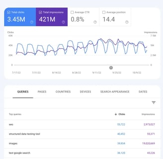 En el ejemplo de arriba, podemos ver que la keyword “seo” ha generado casi 3 millones de impresiones y más de 53 mil clics orgánicos en los últimos 3 meses.