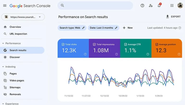 Cuando estés dentro de la plataforma, tienes que hacer clic en el menú “Search Results”. Allí verás un panel que te mostrará los clics totales, impresiones totales, CTR promedio y posición promedio de tu sitio web en un periodo determinado de tiempo.
